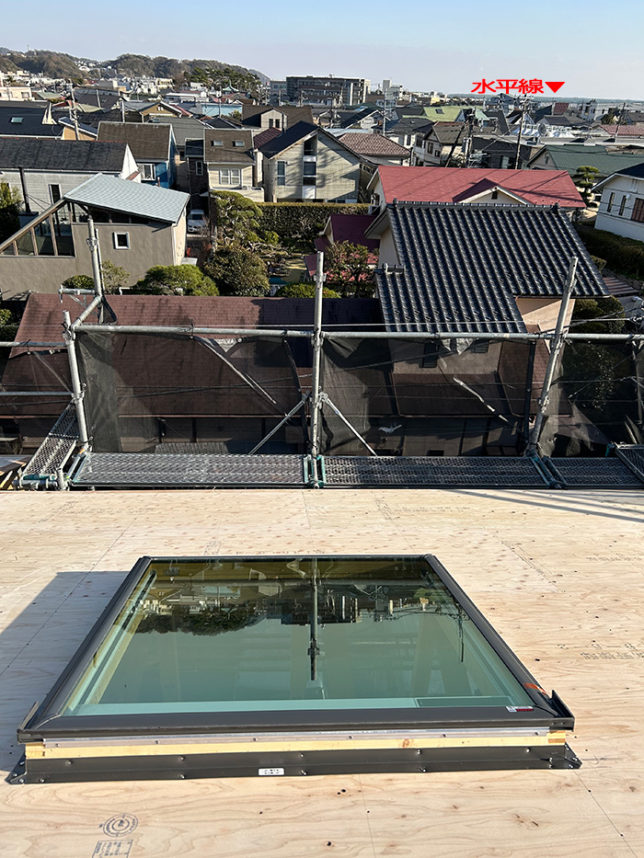 鎌倉 TN-HOME 棟上2日目 2024-03-18 / komaki 鎌倉 TN-HOME 棟上2日目屋根から七里ガ浜の水平線が観えるTN-HOME本日、春一番の様な風で、屋根の合板の施工は緊張しますVELUXのトップライトも設置完了青空が引立ちます。