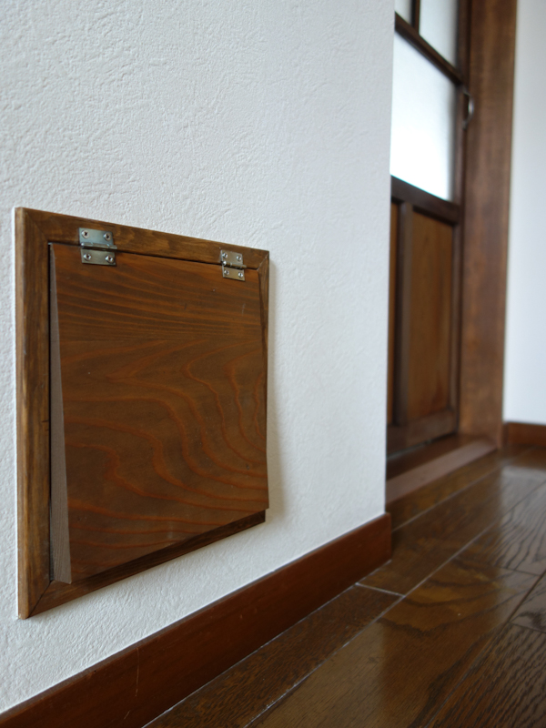 猫用くぐり穴 2026-02-06 / shibasaki 新築ご計画中の YK-HOME 猫ちゃん用くぐり穴を造作します☆ ピーズのくぐり穴は 木枠+木蓋で オリジナル造作☆ 蓋は手動式です☆ 写真は SD-HOME リビングの入口引戸の横に 造作しました☆