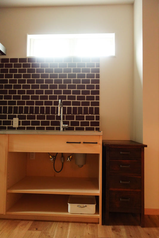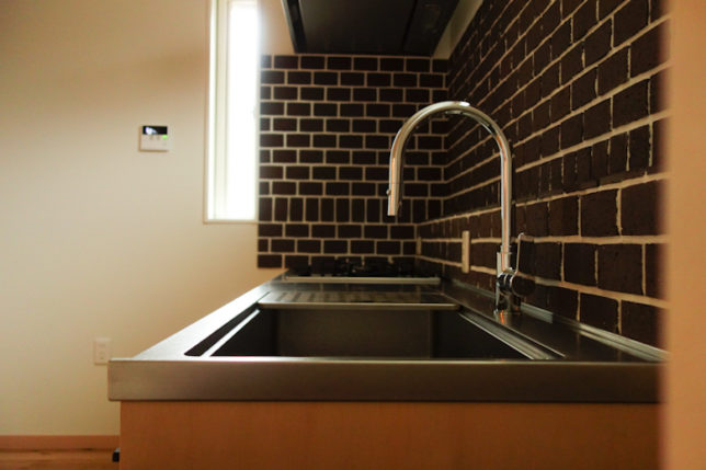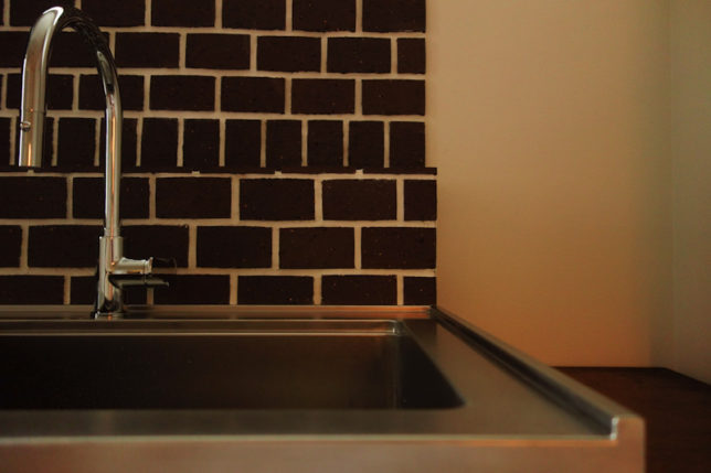 壁は板チョコのようなゴツゴツした素材のレンガタイル もう製造中止で 最後の施工です。。。