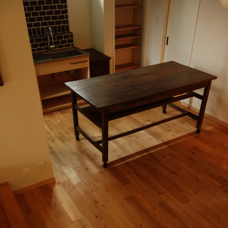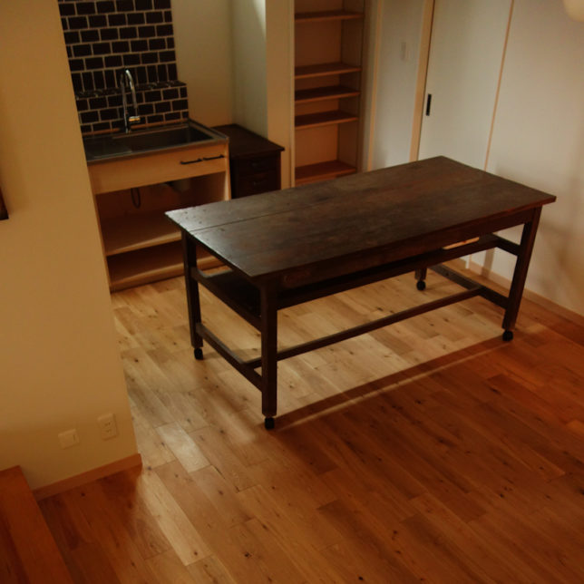 古家具のカッコイイ作業台を キッチンの真ん中に置く事を考えて