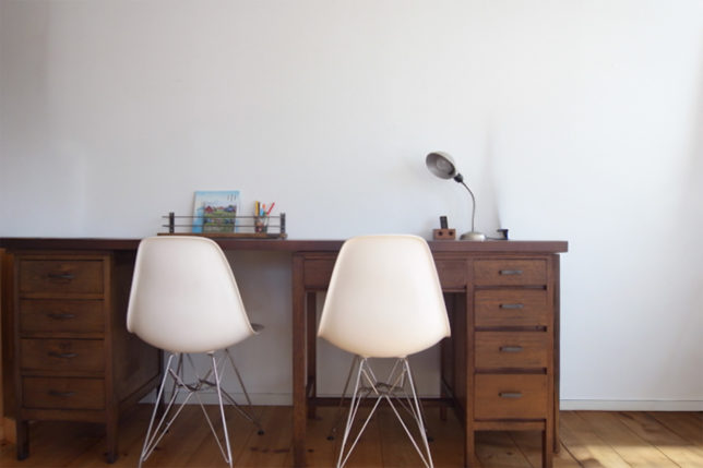 サイドキャビネットを、自由な長さのカウンタ-材で繋げた