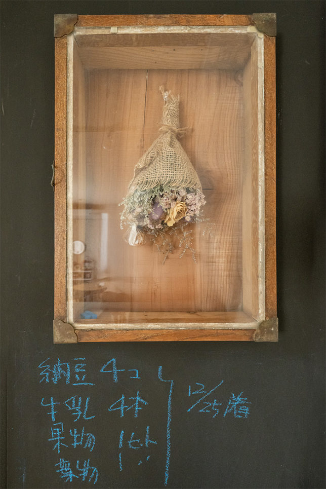 保土ヶ谷 YM-HOME LDKリフォ-ム 2025-12-22 / komaki 保土ヶ谷 YM-HOME LDKリフォ-ム右側 ブラックのチョ-クペイントのメッセ-ジボードと木箱のガラスケースニッチ普段使いはこんな感じに^^。ほっこり^^