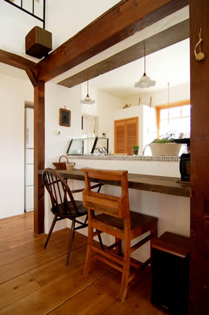 シンクはホーローシンク。横に流れる丸太のビームはHD様購入で安藤さんアレンジ施工。